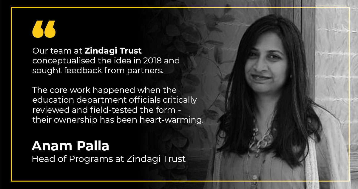 While our team at Zindagi Trust conceptualized the idea and the initial draft in 2018, and sought feedback from external partners therafter, much of the core work happened over the past year as technical experts and officials from the Education Department critically reviewed the form, field tested it with Head Teachers and supported its evolution through several iterations to the final form. The ownership taken by Education Department Officials has been heartwarming - adds Palla.