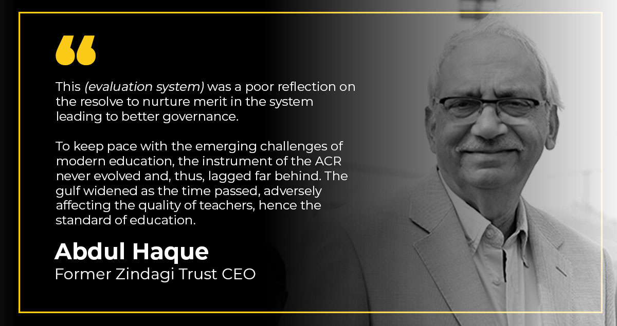 The ACR over the past decades had become a mere formality rather than be an instrument of assessment/evaluation. This was a poor reflection on the resolve to nurture merit in the system, leading to better governance. To keep pace with the emerging challenges of modern education, the instrument of ACR never evolved and thus lagged far behind. The gulf widened as the time passed, affecting adversely the quality of teachers, hence the standard of education. It was to address this gap that Zindagi Trust has been seized with overhauling the ACR Form for nearly four years.
