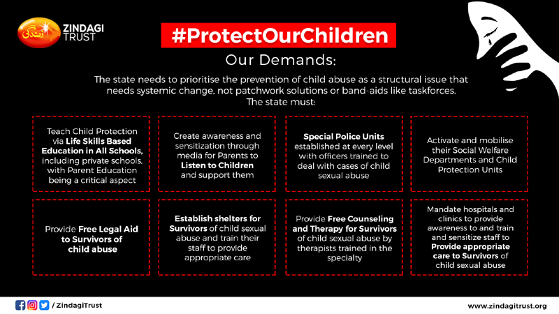 Just over a year ago, we united after the brutal rape and murder of six-year-old Zainab in Kasur and pledged to do our utmost to ensure no other child suffers that fate again. The horrific rape and murder of 10-year-old Farishta in the nation's capital has once again brought agony and shame upon us. Between these two tragedies that have shaken the nation, more than 10 cases of child abuse were reported on average every day (Sahil, 2018). Zindagi Trust, a non-profit working to reform the government education system, brought together Pakistan's leading artists, athletes and activists to push for sustainable action to prevent child sexual abuse. Joining the trust's founder, musician and activist Shehzad Roy were actors Mahira Khan and ZebaBakhtiar, former Pakistan cricket team captain Younus Khan and activist Nazim Haji and Karamat Ali.